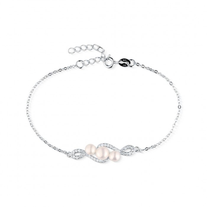 Srebrna bransoletka z naturalnymi perłami i cyrkoniami to propozycja dla kobiet, które kochają klasykę w nowoczesnym wydaniu. Trzy subtelne perły tworzą efektowną kompozycję z falującymi zdobieniami, które wraz z cyrkoniami miękko oplatają nadgarstek świetlistą linią.
