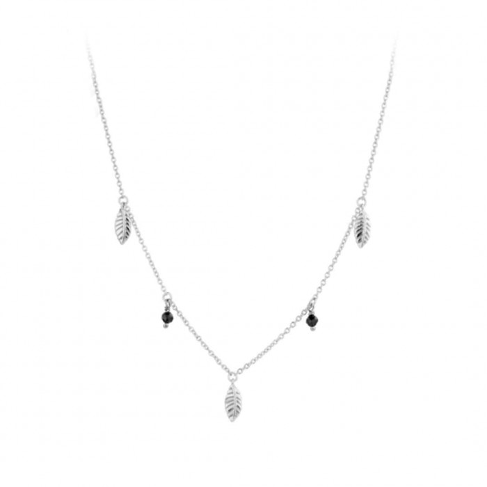 Srebrna bransoletka z zawieszkami w postaci listków i czarnych onyksów.
