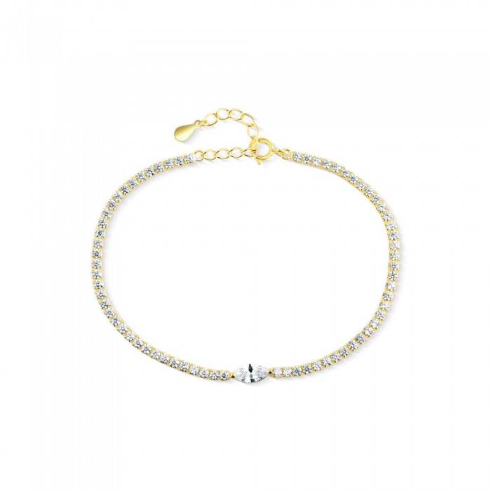 Bransoletka srebrna 925 pozłacana bogato zdobiona cyrkoniami to luksusowy akcent do każdej stylizacji, emanujący blaskiem i elegancją. Wykonana ze srebra najwyższej próby 925 i pokryta 14-karatową warstwą złota, zachwyca trwałością, odpornością na ścieranie oraz wyrazistą, złotą barwą, która podkreśla bogato oprawione, mieniące się cyrkonie na całej długości bransoletki. Centralnie umieszczona, lekko zdobiona kulka przełamuje kompozycję, czyniąc biżuterię jeszcze bardziej wyjątkową, a delikatne wykończenie oraz subtelny połysk sprawiają, że bransoletka sprawdzi się zarówno na wielkie wyjścia, jak i na co dzień. Regulowane zapięcie pozwala dopasować długość do nadgarstka, zapewniając wygodę i komfort noszenia każdego dnia.