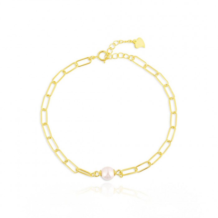 Srebrna pozłacana bransoletka z naturalną białą perłą to idealny wybór dla osób, które lubią, gdy prostota ma w sobie nutę luksusu. Geometryczne, podłużne ogniwa tworzą modny splot typu „paper clip”, a centralnie umieszczona perła dodaje całości eleganckiego, ponadczasowego charakteru.