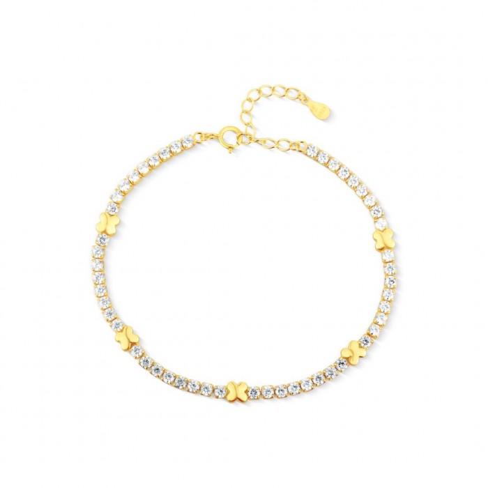 Bransoletka pozłacana 14‑karatowym złotem, wykonana ze srebra próby 925, to olśniewający dodatek, który pięknie rozświetla nadgarstek przy każdym ruchu dłoni. Klasyczny splot typu kostka został misternie wysadzany rzędem błyszczących cyrkonii, pomiędzy którymi rozmieszczono drobne, złociste koniczynki – symbol szczęścia i dobrej energii.