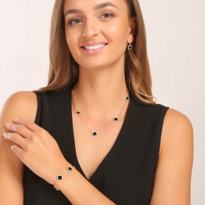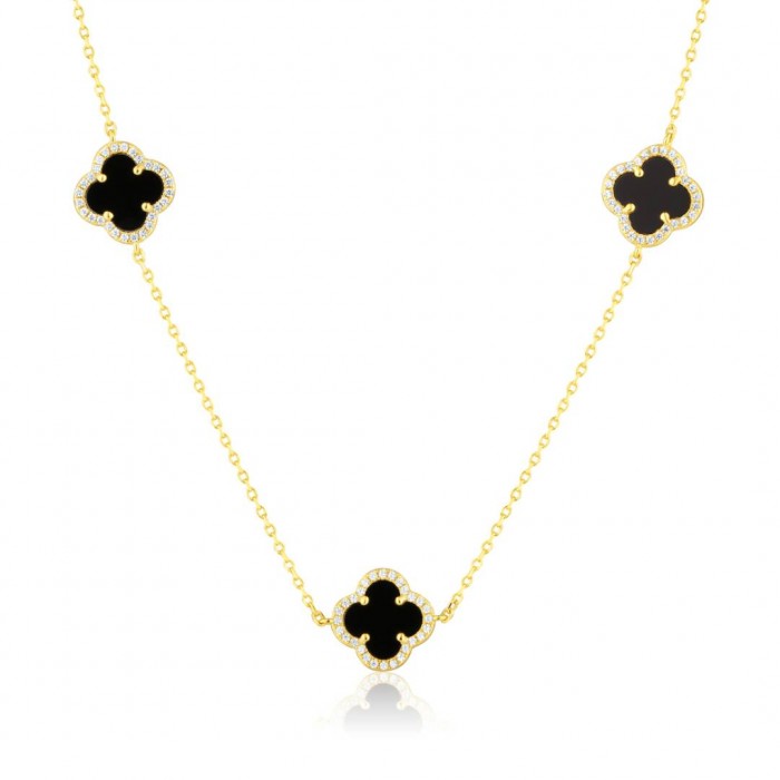 Srebrna złocona bransoletka z czterolistnymi koniczynami zdobionymi czarnym onyksem i lśniącymi cyrkoniami to biżuteria, która łączy wyrazisty charakter z subtelną elegancją. Gładkie, czarne kamienie pięknie kontrastują z ciepłym blaskiem pozłacanego srebra, a drobne cyrkonie otaczające każdy element dodają całości świetlistej, wyjątkowo szlachetnej oprawy.