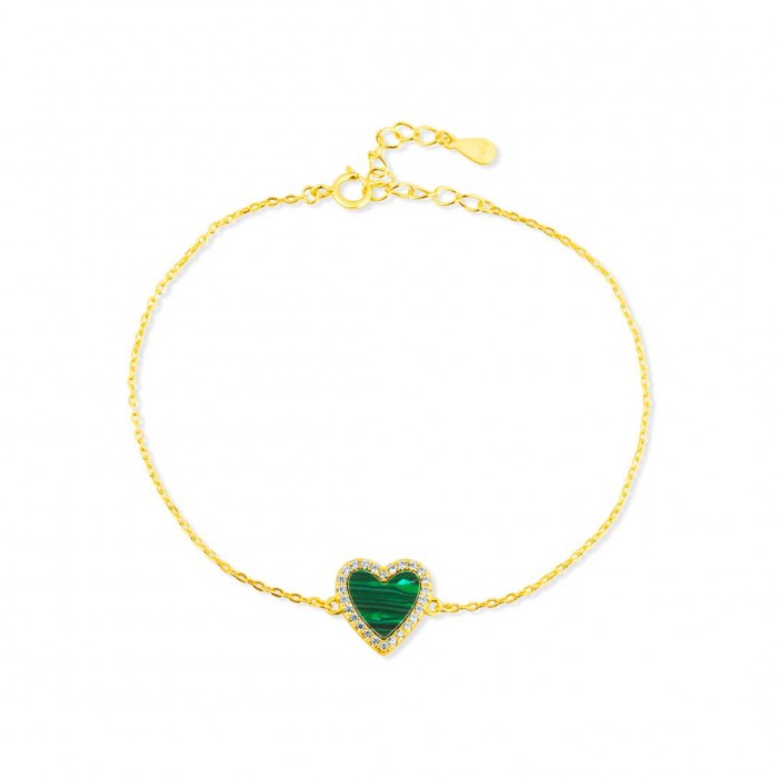 Pozłacana bransoletka srebrna z sercem z malachitem i cyrkoniami to biżuteria, która w wyjątkowo subtelny sposób łączy symbolikę miłości z elegancją naturalnego kamienia. Delikatny łańcuszek z pozłacanego srebra próby 925 stanowi finezyjne tło dla serduszka o głębokiej, zielonej barwie, otoczonego błyszczącym rantem z drobnych cyrkonii.