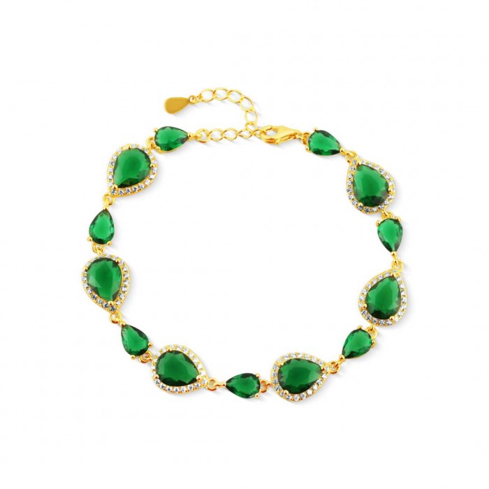 Srebrna bransoletka pozłacana 14‑karatowym złotem z zielonymi cyrkoniami w kształcie łezki to biżuteria, która natychmiast kojarzy się z luksusem i wieczorową elegancją. Soczysta zieleń kamieni pięknie kontrastuje z ciepłym odcieniem złota, a każdy element otoczony jest drobnymi, błyszczącymi cyrkoniami, które tworzą efekt świetlistej ramy.
