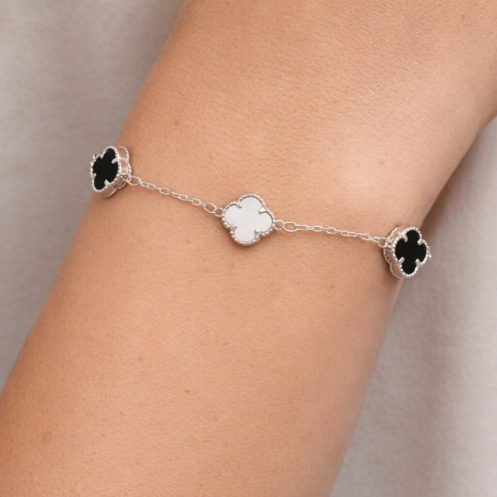 Bransoletka srebrna pr. 925 z zawieszkami o kształcie koniczynek, które ozdobione są masą perłową i onyksem.