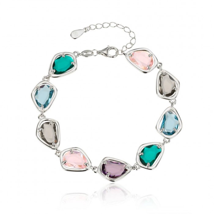 Bransoletka wykonana z rodowanego srebra próby 925 to kwintesencja kolorowej elegancji. Przepiękne, nieregularnie szlifowane cyrkonie w odcieniach błękitu, zieleni, fioletu, różu i szarości tworzą niezwykłą kompozycję, która przyciąga spojrzenia i podkreśla indywidualny styl. Metaliczny połysk srebra doskonale współgra z wielobarwnym blaskiem kamieni, nadając biżuterii luksusowy i energetyczny charakter. Bransoletka posiada wygodną regulację długości od 17 do 20 cm, dzięki czemu perfekcyjnie dopasowuje się do każdego nadgarstka. Ten model to prawdziwa ozdoba na wyjątkowe okazje oraz oryginalny prezent dla osoby, która kocha kolor i wyjątkowy design.