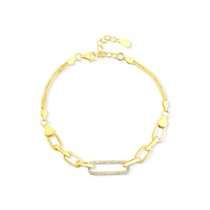 Centralnym punktem bransoletki jest podłużny, owalny element bogato zdobiony błyszczącymi cyrkoniami, które pięknie odbijają światło przy każdym ruchu nadgarstka. Wykonana z pozłacanego srebra próby 925, z dużą dbałością o detale, gwarantuje trwałość i zachwycający blask na lata. To doskonały wybór na prezent dla bliskiej osoby lub jako stylowy akcent własnej kolekcji biżuterii – uniwersalny, a jednocześnie niepowtarzalny.