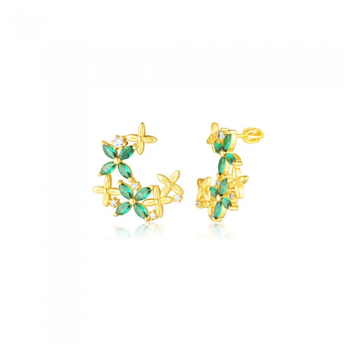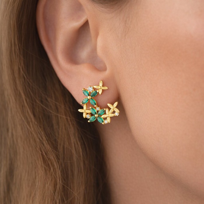 Kolczyki srebrne 925 zakręcane pozłacane kwiaty z zielonymi cyrkoniami to wyjątkowa propozycja dla miłośniczek eleganckiej biżuterii inspirowanej naturą, która łączy intensywną zieleń kamieni z ciepłym blaskiem złota. Wykonane są ze srebra próby 925 pokrytego 14‑karatową warstwą złota, dzięki czemu zachwycają luksusowym wyglądem, a jednocześnie pozostają lekkie i komfortowe w noszeniu przez cały dzień. Front kolczyków tworzy subtelny, półkolisty układ kwiatów – płatki powstały z podłużnych, markizowych zielonych cyrkonii o barwie przypominającej szmaragd, uzupełnionych drobnymi białymi cyrkoniami, które dodają kompozycji świetlistego blasku i podkreślają trójwymiarową formę wzoru.