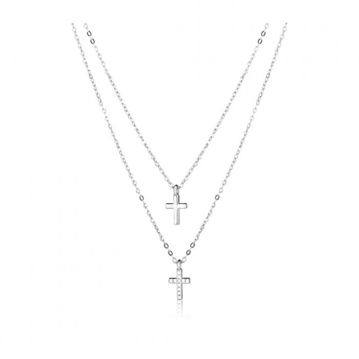 Stylowy podwójny naszyjnik wykonany z rodowanego srebra próby 925, ozdobiony dwoma krzyżami, które dodają mu wyjątkowego charakteru. Jeden z krzyżyków, umieszczony na dłuższym łańcuszku, jest subtelnie zdobiony cyrkoniami, co nadaje biżuterii elegancji i blasku. Drugi krzyż pozostaje klasyczny, tworząc harmonijny kontrast pomiędzy prostotą a zdobnictwem.