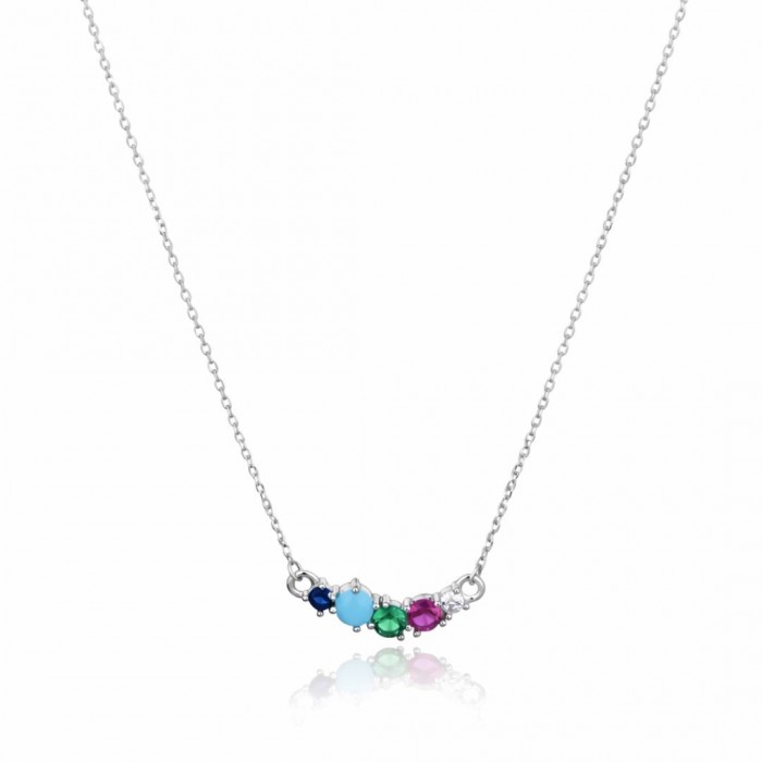 Główną ozdobą naszyjnika jest subtelnie wygięty łuk, w którym oprawiono pięć lśniących cyrkonii w zjawiskowych kolorach: