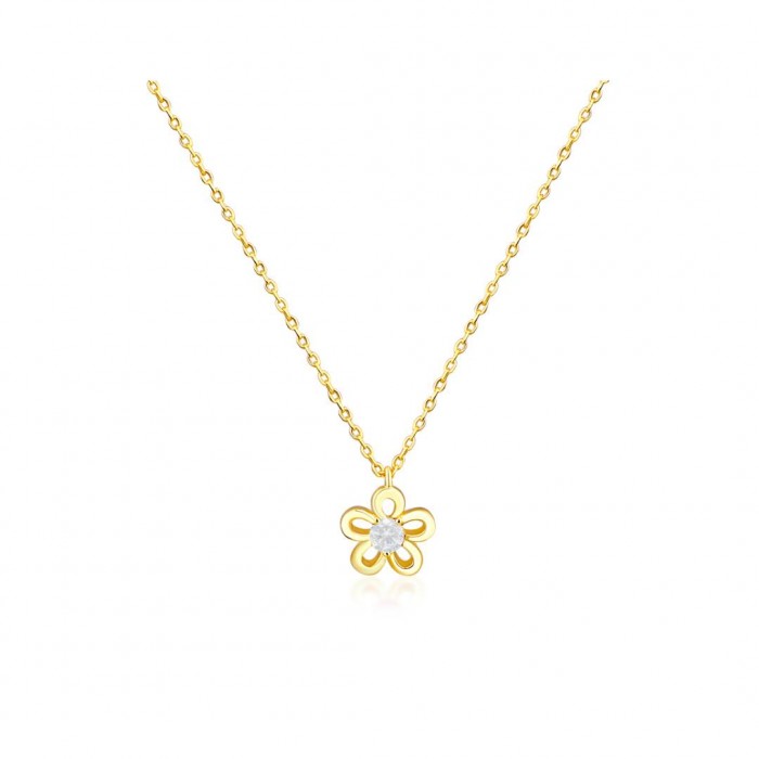 Srebrny pozłacany naszyjnik próby 925 z zawieszką w kształcie kwiatka to biżuteria, która zachwyca delikatnością i wdziękiem. Zawieszka, przypominająca subtelny kwiat, ozdobiona jest cyrkonią, która dodaje całości elegancji i przyciąga spojrzenia. To wyjątkowy dodatek, który łączy w sobie naturalne inspiracje i ponadczasowy styl.