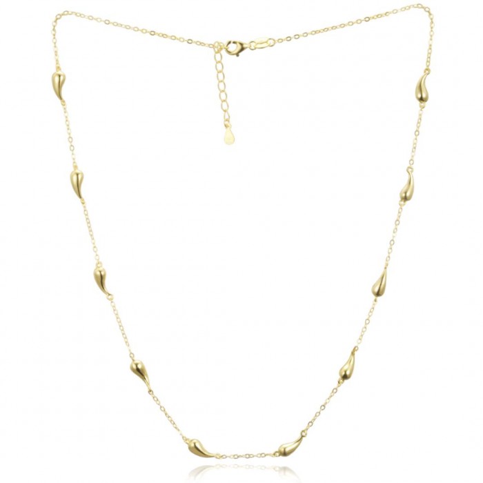 Srebrny naszyjnik z zawieszkami w kształcie kropelek to biżuteria, która pięknie podkreśla szyję i dodaje stylizacjom subtelnej elegancji. Lśniące, pozłacane srebro sprawia, że całość prezentuje się wyjątkowo szlachetnie, a zarazem nowocześnie. Delikatne kropelki rozmieszczone na całej długości łańcuszka układają się niczym drobne krople deszczu zatrzymane w ruchu, tworząc lekki i bardzo kobiecy efekt.