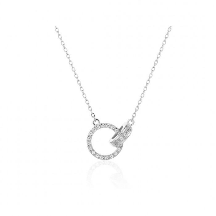 Ten srebrny naszyjnik to minimalistyczna kompozycja o wyjątkowo artystycznym wyrazie. Dwie przecinające się zawieszki – okrąg i stylizowana litera „D” – zostały misternie ozdobione błyszczącymi cyrkoniami, które nadają całości wytwornego charakteru i subtelnego blasku. Regulowana długość łańcuszka (od 44 do 47 cm) pozwala idealnie dopasować biżuterię do każdej stylizacji, podkreślając szyję z modną lekkością. To designerski dodatek, który doskonale sprawdzi się zarówno na co dzień, jak i podczas wyjątkowych okazji, wyrażając indywidualność właścicielki.
