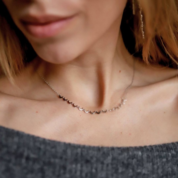 Niezwykle elegancki naszyjnik z motywem księżyca to biżuteryjna propozycja dla kobiet oczekujących subtelnego uroku i wyrafinowanego stylu. Wykonany z wysokiej jakości rodowanego srebra próby 925, zachwyca lśniącymi zawieszkami o kształcie księżyców, które pięknie układają się na szyi, dodając każdej stylizacji niepowtarzalnego blasku. Regulowana długość od 42 do 47 cm zapewnia komfort noszenia i idealne dopasowanie do każdej kreacji. Ten ponadczasowy dodatek podkreśli indywidualny styl, a pokrycie warstwą złota gwarantuje trwałość oraz luksusowy połysk przez długi czas.
