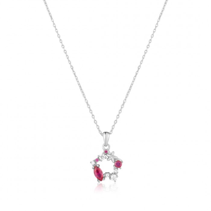 Srebrny naszyjnik z okrągłą zawieszką wysadzaną różowymi i białymi kamieniami to biżuteria, która łączy romantyczny charakter z nowoczesną formą. Delikatny łańcuszek z rodowanego srebra próby 925 miękko układa się na dekolcie, a misternie skomponowany okrąg z różowymi akcentami i lśniącymi cyrkoniami tworzy efekt świetlistego, kobiecego detalу.