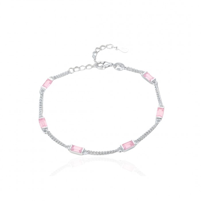 Ten srebrny naszyjnik to harmonijne połączenie klasycznego stylu z nowoczesną elegancją, zaprojektowane dla kobiet, które cenią subtelną, a zarazem wyrazistą biżuterię. Wykonany z wysokiej jakości srebra próby 925, naszyjnik prezentuje delikatny splot typu drobna pancerka, który idealnie przylega do szyi, nadając całości niezwykle wyrafinowany charakter. Na całej długości naszyjnika równomiernie rozmieszczono prostokątne różowe cyrkonie, które swoim perfekcyjnym szlifem i blaskiem dodają mu wyjątkowego, luksusowego wyglądu.