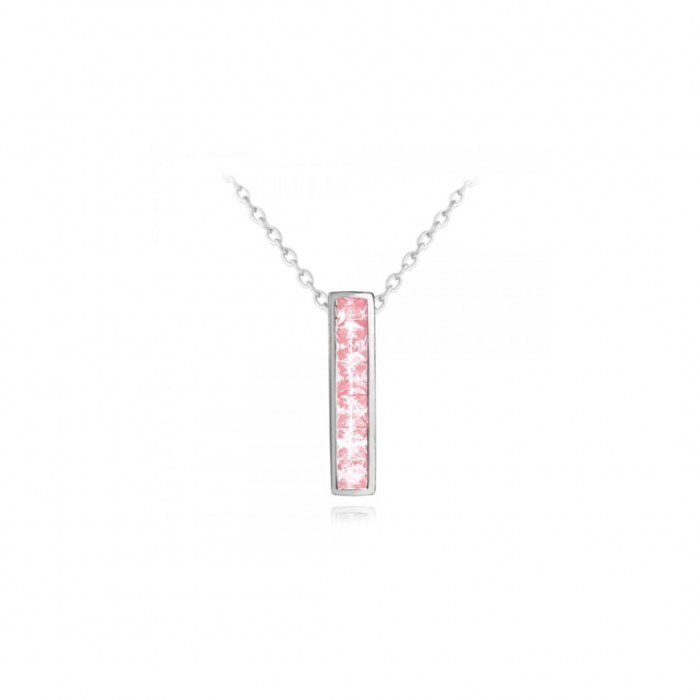 Srebrny naszyjnik z podłużną wiszącą zawieszką, ozdobioną błyszczącymi cyrkoniami w kolorze różowym. Naszyjnik będzie idealnym dodatkiem do każdej codziennej stylizacji.