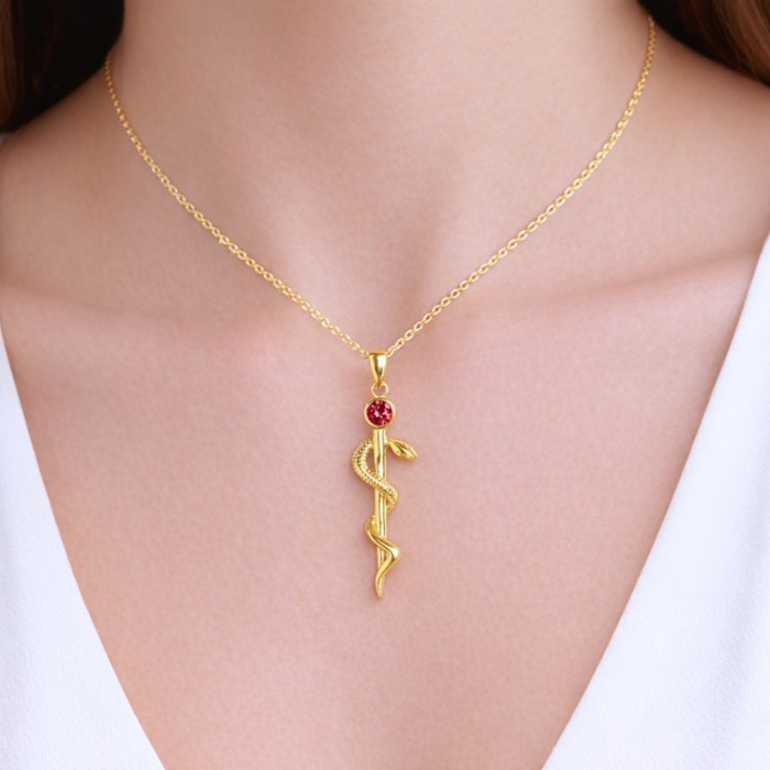 Szukasz prezentu dla lekarza, pielęgniarki lub farmaceuty? Zaskocz ich pięknym srebrnym pozłacanym naszyjnikiem z laską eskulapa, symbolem zdrowia i życia. Naszyjnik jest wykonany z wysokiej jakości srebra próby 925 i pokryty 14-karatowym złotem. Laska eskulapa ma długość 4 cm i jest ozdobiona subtelnym wężem, który oplata się wokół niej oraz czerwoną cyrkonią. Naszyjnik ma długość 45 cm i zapinany jest na karabińczyk. To idealny prezent dla każdego, kto pracuje w zawodach medycznych i chce podkreślić swoją pasję i zaangażowanie.