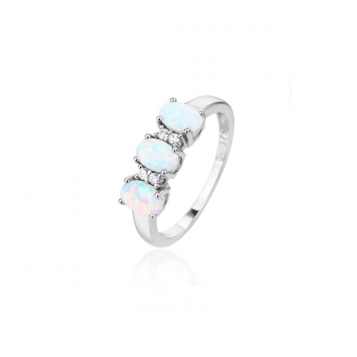 Ten elegancki pierścionek wykonany z najwyższej jakości rodowanego srebra próby 925 to idealny wybór dla kobiet ceniących subtelną elegancję i wyjątkowe detale. Centralnym punktem biżuterii są trzy białe opale syntetyczne, które przyciągają uwagę swoim głębokim, hipnotyzującym kolorem. Każdy z opali został precyzyjnie osadzony, a ich blask dodatkowo podkreślają drobne, przezroczyste cyrkonie umieszczone po bokach.