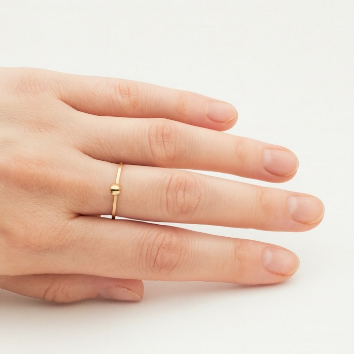 Elegancki pierścionek wykonany z najwyższej jakości złota próby 585 to esencja minimalistycznej elegancji, która zachwyca swoją subtelnością i ponadczasowym stylem. Jego wyjątkowy design opiera się na prostocie – delikatna, złota obrączka ozdobiona drobną kuleczką, która nadaje całości wyrafinowanego charakteru. Brak kamieni szlachetnych w projekcie podkreśla minimalistyczną estetykę, sprawiając, że pierścionek emanuje dyskretnym luksusem, który przyciąga wzrok swoją delikatnością i elegancją.