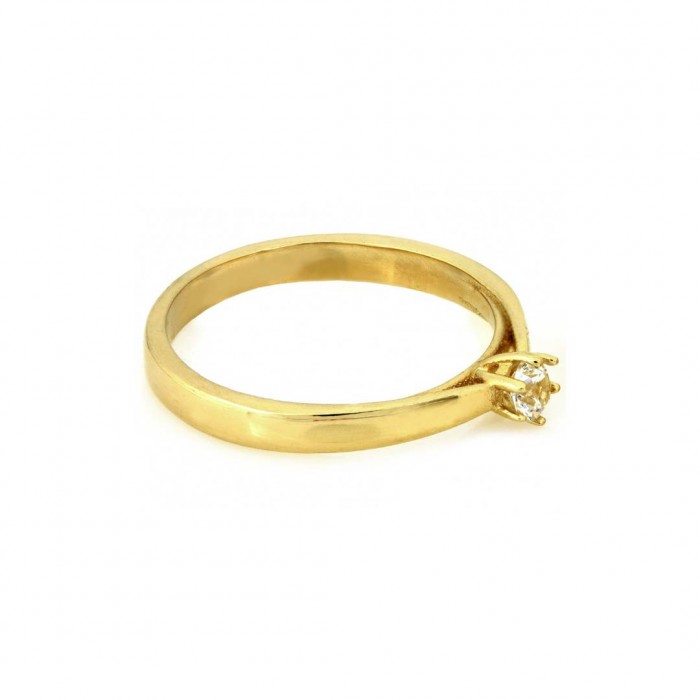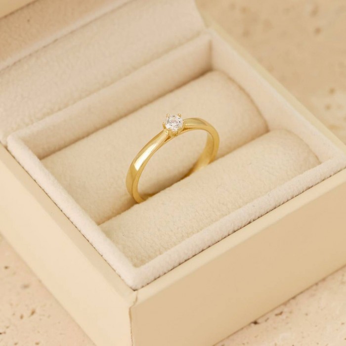 Pierścionek zaręczynowy z żółtego złota próby 585 to kwintesencja klasyki i ponadczasowego wdzięku. Smukła, subtelna obrączka zachwyca szlachetnym, gładkim wykończeniem i idealnie współgra z centralnym elementem — krystalicznie czystą cyrkonią osadzoną w sześcioramiennej, stabilnej oprawie. Precyzyjny szlif kamienia sprawia, że efektownie odbija światło, tworząc spektakularne refleksy i podkreślając unikalny blask złota. Solidna konstrukcja gwarantuje trwałość i bezpieczeństwo, a minimalistyczny design łączy nowoczesność z tradycją. Ten pierścionek to doskonały wybór na zaręczyny, rocznicę lub jako codzienny, stylowy symbol miłości i elegancji.