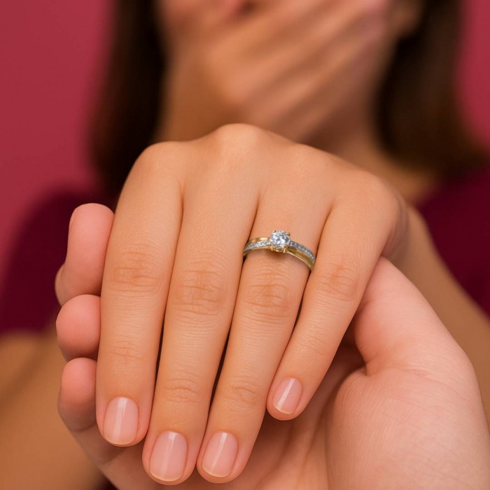 Odkryj ponadczasową elegancję w dwukolorowym pierścionku zaręczynowym, wykonanym z połączenia żółtego i białego złota próby 585. Centralną część projektu zdobi lśniąca cyrkonia o krystalicznej czystości, pewnie osadzona w oprawie typu koszyczek, która efektownie wydobywa jej blask. Szynę pierścionka zdobią rzędy drobnych cyrkonii, potęgując efekt olśniewającej świetlistości całości. Perfekcyjnie dopracowany w każdym detalu pierścionek staje się symbolem miłości, trwałości i wyjątkowych uczuć – idealny na zaręczyny lub jako niepowtarzalny prezent dla wyjątkowej osoby.