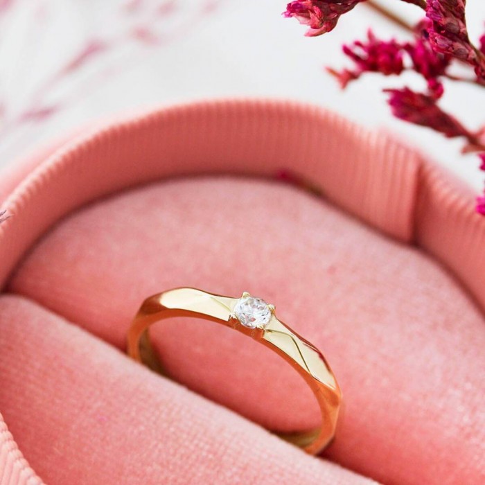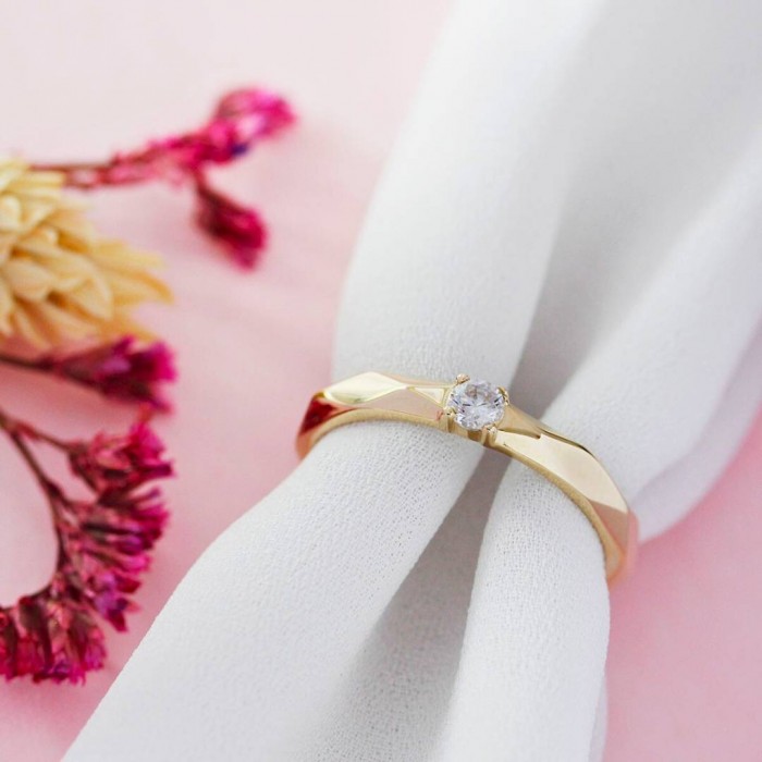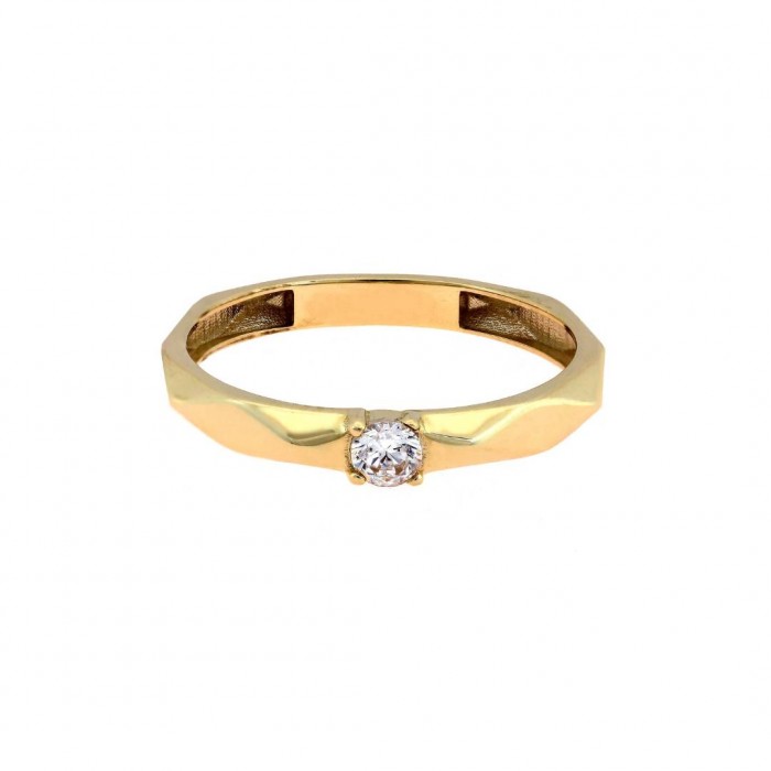 Pierścionek zaręczynowy z żółtego złota próby 585 to wyrafinowana klasyka z nowoczesnym akcentem. Geometryczna, lekko czworokątna obrączka zachwyca gładkim, szlachetnym wykończeniem i wyjątkowym konturem, który podkreśla indywidualny styl biżuterii. Centralny punkt stanowi krystalicznie czysta cyrkonia o brylantowym szlifie, osadzona w czteroramiennej, eleganckiej oprawie. Minimalistyczny projekt harmonijnie łączy tradycję z nowoczesnym designem, tworząc ponadczasowy symbol miłości, idealny na zaręczyny, rocznicę lub jako stylowy dodatek w codziennych stylizacjach. Trwałość, bezpieczeństwo kamienia i perfekcyjna linia sprawiają, że pierścionek długo będzie zachwycał swoim blaskiem.