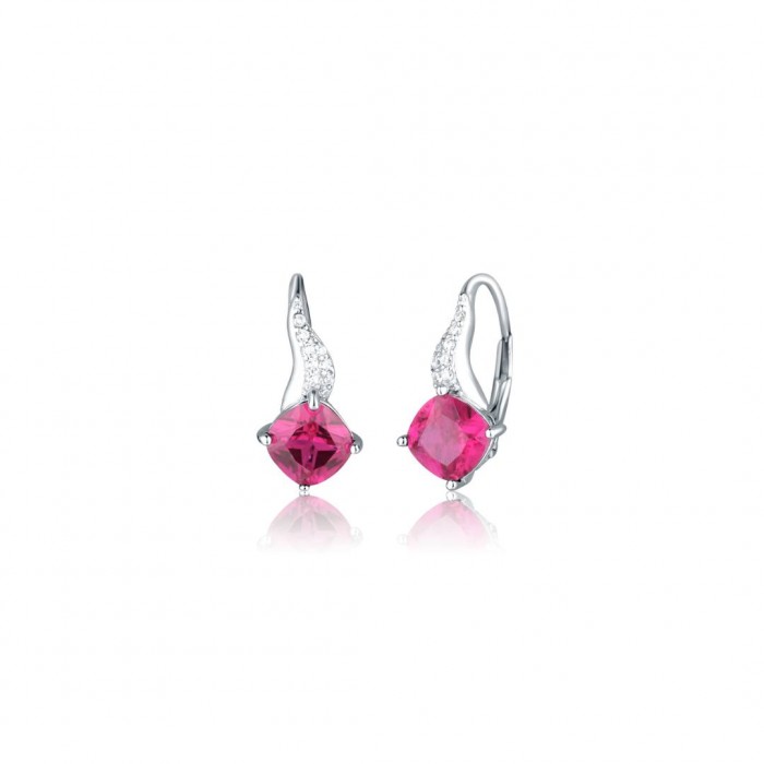 Centralnym punktem projektu jest precyzyjnie osadzona, jasnoczerwona cyrkonia o szlifie poduszkowym (cushion), charakteryzująca się wyjątkową przejrzystością i głębią barwy. Kamień został umieszczony w ozdobnej oprawie przypominającej finezyjny, falujący płomień, który wysadzono mniejszymi, białymi cyrkoniami. Ta kompozycja sprawia, że biżuteria przepięknie rozprasza światło przy każdym ruchu, dodając stylizacji luksusowego charakteru.