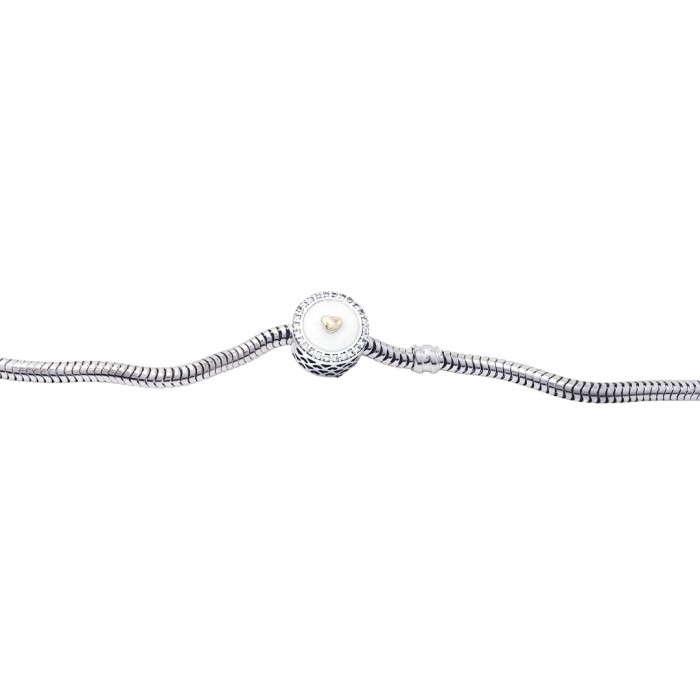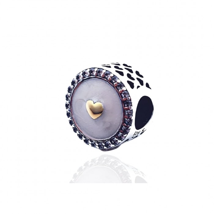 Charms srebrny do bransoletki modułowej o okrągłym kształcie. Zawieszkę wykończono cyrkoniami i białą emalią z małym pozłacanym serduszkiem na środku. Charms pasuje do bransoletek modułowych popularnych marek, może również posłużyć jako zawieszka do naszyjnika. Średnica otworu to 4,5 cm.