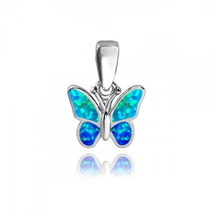 Srebrna zawieszka zdobiona niebieskim opalem syntetycznym - motylkiem.