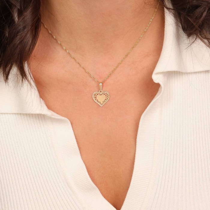 Złota zawieszka w kształcie serca to olśniewający manifest elegancji i uczuć. Wykonana ze szlachetnego żółtego złota próby 585, zachwyca misteryjnym, ażurowym wykończeniem, które otacza klasyczne, lustrzanie gładkie serduszko w środku. Geometryczna, misternie zaprojektowana ramka przypomina fantazyjną koronkę lub promienie światła, nadając całości wyrazistego, nowoczesnego wyrazu. Centralna, pełna część aż prosi się o osobisty grawer — to świetny sposób, by zawieszka stała się unikatową pamiątką lub wyjątkowym prezentem pełnym emocji. Dzięki wielkości 16 x 16 mm zawieszka doskonale prezentuje się na dekolcie, nadając blasku każdemu dniu i podkreślając styl zarówno codziennych, jak i świątecznych kreacji. Ta biżuteria to zaproszenie do celebrowania ważnych chwil i ludzi w życiu.
